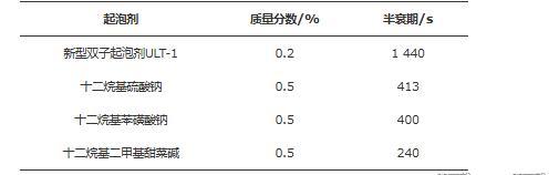 起泡性能主要是指起泡能力和泡沫穩(wěn)定性。發(fā)泡體積V0反映了起泡能力,析液半衰期t1/2反映了泡沫穩(wěn)定性。在室溫下,稱取一定質(zhì)量的起泡劑ULT-1于攪拌杯中,加入100 mL蒸餾水,置于攪拌器之上,以轉(zhuǎn)速11 000 r/min攪拌1 min。攪拌完畢后,立即取下攪拌杯,同時(shí)啟動秒表,開始記錄消泡時(shí)間,將攪拌杯中的所有物質(zhì)全部倒入1 000 mL量筒中,讀取發(fā)泡體積和從泡沫中析出50 mL液體的時(shí)間,即為半衰期。通過改變起泡劑ULT-1的質(zhì)量測量起泡性能與起泡劑質(zhì)量分?jǐn)?shù)的關(guān)系,結(jié)果如圖7所示。從圖7可知:隨起泡劑ULT-1質(zhì)量分?jǐn)?shù)的提高,發(fā)泡體積增加幅度較大,半衰期緩慢增加。當(dāng)ULT-1質(zhì)量分?jǐn)?shù)升到0.2%時(shí),發(fā)泡體積達(dá)到501 mL,半衰期達(dá)到1 440 s,繼續(xù)提高質(zhì)量分?jǐn)?shù)發(fā)泡體積和半衰期基本不變,表明研制的新型起泡劑ULT-1低濃度時(shí)即具有較高的起泡性能,發(fā)泡體積高,泡沫半衰期長。同時(shí),對比評價(jià)了常用起泡劑的半衰期,結(jié)果如表1所示。從表1可知:質(zhì)量分?jǐn)?shù)為0.2%的起泡劑ULT-1與質(zhì)量分?jǐn)?shù)為0.5%的常規(guī)起泡劑相比,泡沫半衰期可提高3倍以上。