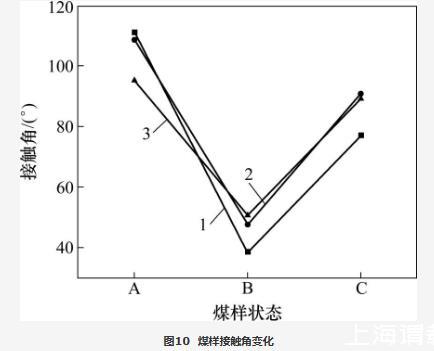 煤樣潤濕性變化主要反映了起泡劑在煤樣表面的吸附與脫附情況,可以根據(jù)接觸角θ判斷潤濕性情況。通常把θ=90°作為是否潤濕的界限,θ>90°表明不潤濕,θ<90°表明潤濕,θ越小,潤濕性能越好。分別取滇東黔西地區(qū)的松河15號煤樣、恩洪16號煤樣和天井8號煤樣,利用接觸角/表面張力測量儀通過五點(diǎn)擬合法分別測量純水在原始煤樣(A狀態(tài))、0.2%起泡劑ULT-1溶液浸泡1 h烘干的煤樣(B狀態(tài))、0.2%起泡劑ULT-1溶液浸泡1 h后低速水流沖洗1 h烘干的煤樣(C狀態(tài))表面的接觸角,結(jié)果如圖10所示。將C狀態(tài)接觸角與B狀態(tài)接觸角的差值定義為接觸角增加值,C狀態(tài)接觸角與A狀態(tài)接觸角的比值定義為潤濕性恢復(fù)值,間接反映了新型起泡劑ULT-1在煤樣表面的脫附程度,潤濕性恢復(fù)值越大,越易脫附,脫附程度越大。原始煤樣接觸角均大于90°,為水不潤濕(A狀態(tài)),起泡劑ULT-1在煤樣表面吸附后接觸角均小于90°,將煤樣表面變?yōu)橹卸葷櫇?B狀態(tài)),但是低速水流沖洗吸附了起泡劑ULT-1的煤樣1 h后,接觸角均明顯增大,松河15號與天井8號煤樣的接觸角增加38°以上,接近90°,變?yōu)槿鯘櫇?C狀態(tài)),恩洪16號煤樣的接觸角增加43°以上,超過90°,變?yōu)椴粷櫇?C狀態(tài))。各煤樣潤濕性恢復(fù)值均超過69%,天井8號潤濕性恢復(fù)值最高達(dá)到93.70%,表明新型起泡劑ULT-1在煤層氣排液開采過程中易于脫附,有利于儲層保護(hù)。