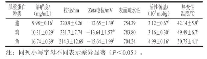 表面疏水性同時(shí)又與其他指標(biāo)有著密不可分的關(guān)系,例如熱變性溫度,因?yàn)檫m當(dāng)?shù)臒崽幚頃?huì)造成肌漿蛋白內(nèi)部疏水基團(tuán)暴露在蛋白質(zhì)表面,從而使蛋白質(zhì)的表面疏水性增強(qiáng),這樣就可以改善蛋白質(zhì)的乳化活性和乳化穩(wěn)定性。3種肌漿蛋白熱變性溫度都較低,在40~55℃之間,其中魚(yú)肉肌漿蛋白變性溫度最高而豬肉肌漿蛋白最低,且豬肉肌漿蛋白熱變性溫度與雞肉和魚(yú)肉間差異顯著(P<0.05),而雞肉與魚(yú)肉肌漿蛋白間的變性溫度無(wú)顯著性差異。所以在肌漿蛋白的研究中,如何根據(jù)不同蛋白的變性溫度差異,準(zhǔn)確控制熱處理的強(qiáng)度至關(guān)重要,本研究可給蛋白變性凝聚組裝類(lèi)的研究提供基礎(chǔ)數(shù)據(jù)的參考。