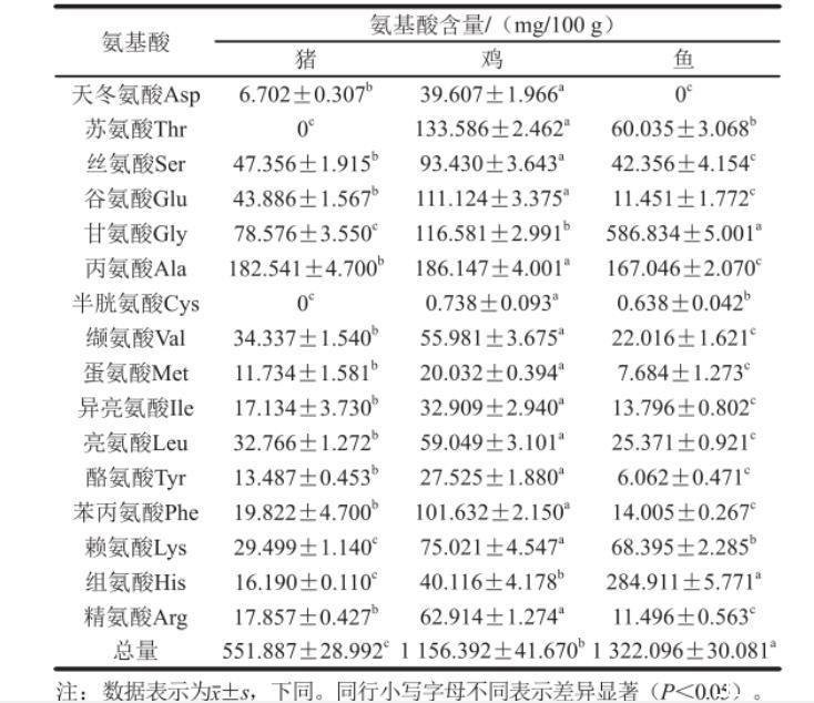 2.1 3種肉肌漿蛋白的氨基酸組成分析