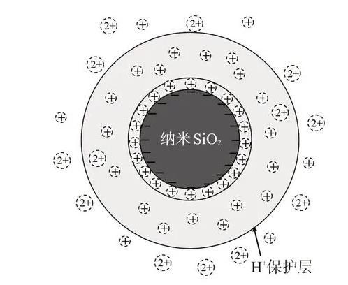 SiO2表面的羥基會和H+發(fā)生反應(yīng),所以和Ca2+、Mg2+、Na+離子相比,H+更容易吸附在納米顆粒表面。當(dāng)體系中含有足夠量的H+時(shí),H+離子可以在納米SiO2周圍形成保護(hù)層,如圖4所示。模擬地層水中極少量的二價(jià)Ca2+、Mg2+也會使納米SiO2失去穩(wěn)定性,H+保護(hù)層的存在降低了納米SiO2雙電層中二價(jià)離子的含量,從而減少了二價(jià)陽離子對納米SiO2穩(wěn)定性的破壞。