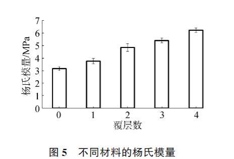 對羥基磷灰石和覆層材料的楊氏模量進行了測量,結(jié)果如圖5所示。空白的羥基磷灰石材料的楊氏模量為3.14±0.16 MPa,隨著覆層層數(shù)的增加楊氏模量逐漸增加,最高可達6.21±0.18 MPa,說明膠原蛋白肽的覆層能夠有效地改善羥基磷灰石材料的力學(xué)性能,提高其楊氏模量。