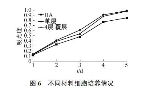 MC3T3-E1細胞在羥基磷灰石和覆層材料上培養(yǎng)5天的增殖情況見圖6。因結(jié)果類似,圖中僅列出了單層和4層覆層材料的增殖結(jié)果,可以看出在覆層材料上MC3T3-E1細胞增殖要優(yōu)于空白羥基磷灰石材料,表明所制覆層材料不僅無細胞毒性,而且因膠原蛋白肽的優(yōu)良生物相容性,能一定程度上促進細胞增殖。所用的羥基磷灰石和膠原蛋白肽都是經(jīng)過實踐證明的生物相容性良好的材料,其對材料生物性能的提升作用是由其本身的生物相容性良好引起的,因此覆層層數(shù)對生物性能提升作用不明顯。