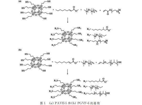 在已經(jīng)加入25mL二氯甲烷溶劑的50mL圓底燒瓶中加入定量組分的APEG400、VDMS和FEMA,進(jìn)行混合溶解,最后加入1%(質(zhì)量分?jǐn)?shù))的光引發(fā)劑溶解完全后進(jìn)行封口處理,于溫度為30℃、攪拌速度為300r/min的條件下,放置于紫外燈(20W)照射45min,反應(yīng)結(jié)束后,旋蒸除去溶劑,最終得到無(wú)色透明、流動(dòng)性明顯且富有粘稠狀態(tài)的液體產(chǎn)物POSS-APEG4001-VDMS2-FEMA5,簡(jiǎn)稱(chēng)為PAVE-5。同樣的方法改變其中之一的單體為APEG750,合成得到POSS-APEG7501-VDMS1-FEMA,簡(jiǎn)稱(chēng)PGVF-6。