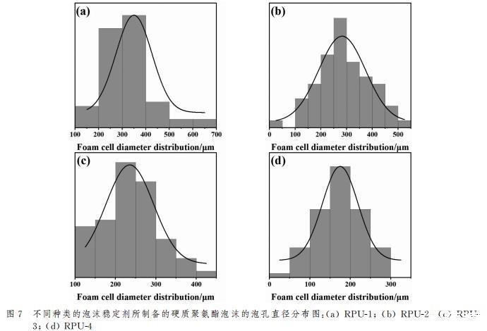 為了對聚氨酯泡沫孔徑大小和分布情況進(jìn)行量化,通過ImageJ軟件對SEM測試結(jié)果進(jìn)行處理分析,其孔徑分布直方圖如圖7所示。通過泡沫的孔徑分布直方圖對比結(jié)果可以看出,添加國產(chǎn)-1的聚氨酯泡沫孔徑分布范圍在100~700μm,存在較大直徑的泡孔,添加進(jìn)口-2的聚氨酯泡沫泡孔直徑分布范圍在0~550μm,雖然分布范圍有變窄,但也存在較大泡孔直徑,添加PAVE-5的聚氨酯泡沫泡孔直徑分布范圍在100~450μm,泡孔分布范圍減小,但仍然存在超過400μm的大泡孔,分布范圍最窄的是添加PGVF-6泡沫穩(wěn)定劑的硬質(zhì)聚氨酯泡沫,分布范圍在0~300μm,沒有超過400μm直徑的泡孔,泡沫泡孔直徑得以減小,泡沫泡孔細(xì)小均勻。這種微觀結(jié)構(gòu)上的改善可能得益于在發(fā)泡過程中,接枝APEG的POSS可以作為三維網(wǎng)絡(luò)結(jié)構(gòu)的交聯(lián)點(diǎn),通過其與聚氨酯基體的相容性,親水性-OH基團(tuán)有助于形成更加穩(wěn)定的泡沫結(jié)構(gòu)。