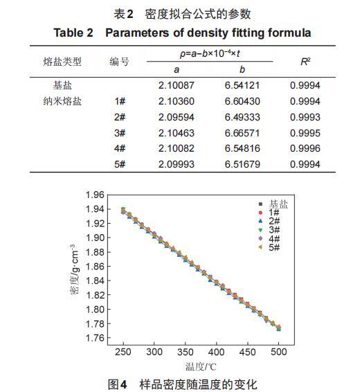 研究表明,在solar salt中加入SiO_2納米顆粒后,熔點(diǎn)會(huì)有一定程度的下降,分解溫度會(huì)有一定程度的提高。并且solar salt的熔點(diǎn)為218.2℃,所以當(dāng)熔鹽加熱到250℃時(shí),已經(jīng)完全熔化;當(dāng)熔鹽溫度超過600℃時(shí),熔鹽會(huì)開始分解。溫度較高和溫度較低都會(huì)對(duì)實(shí)驗(yàn)測(cè)量的數(shù)據(jù)產(chǎn)生影響,造成較大的實(shí)驗(yàn)誤差。因此基鹽及納米熔鹽密度實(shí)驗(yàn)數(shù)據(jù)測(cè)定范圍為260~500℃。