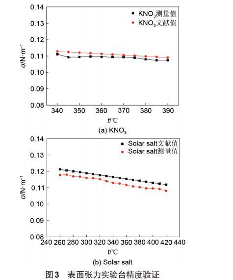 本實(shí)驗(yàn)先對(duì)NaNO3的表面張力進(jìn)行測(cè)量,得到儀器系數(shù)C。由式(4)可知,儀器系數(shù)C與溫度無關(guān),對(duì)NaNO3在5個(gè)溫度工況點(diǎn)下的表面張力進(jìn)行測(cè)量,并且每個(gè)溫度工況點(diǎn)采集3次測(cè)實(shí)驗(yàn)數(shù)據(jù),通過最終的計(jì)算得到本實(shí)驗(yàn)臺(tái)的儀器系數(shù)C=0.00053。對(duì)KNO和solar salt的表面張力進(jìn)行測(cè)量后,與文獻(xiàn)值進(jìn)行對(duì)比,如圖3所示。