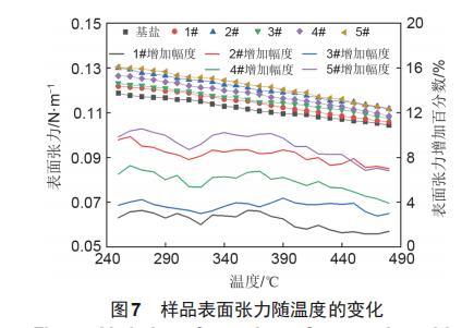 樣品的表面張力值隨溫度變化如圖7所示??梢钥吹?,在250~480℃內,基鹽的表面張力在0.1044~0.1188N/m,表面張力隨溫度的升高呈下降趨勢。1#納米熔鹽的表面張力在0.1059~0.1219N/m,對數據進行擬合后,擬合系數在0.995以上,擬合程度較好。2#納米熔鹽的表面張力在0.1117~0.1301N/m,擬合系數為0.996,隨溫度變化的趨勢和基鹽及一般熔鹽表面張力的變化趨勢保持一致,均隨溫度的升高呈下降趨勢。3#和4#納米熔鹽的表面張力在0.1075~0.1232 N/m和0.1085~0.1265 N/m,擬合系數都在0.994以上,其中4#納米熔鹽的擬合系數與2#納米熔鹽的擬合系數相同,均為0.996,擬合程度最好。5#納米熔鹽的表面張力在0.1115~0.1305N/m,擬合系數為0.991。
