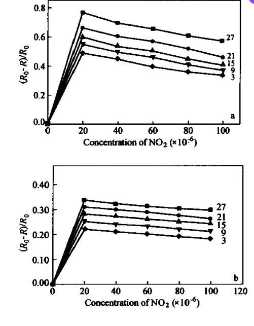 LB膜越薄,與氣體的接觸越充分,被氧化的程度也越高,因而對氣體的響應(yīng)也就越快。同層的PAN/NMP LB膜較PAN-AA/NMP LB膜具有更快的響應(yīng)。3層聚苯胺LB膜對相對百分比為20×10??NO?的響應(yīng)時(shí)間為10 s,但是當(dāng)層數(shù)增加到27層時(shí),響應(yīng)時(shí)間就上升到90 s。而對于27層的聚苯胺與乙酸的混合LB膜,響應(yīng)時(shí)間就更長,接近3 min。另一方面,響應(yīng)時(shí)間還隨NO?氣體濃度的增加而增長。圖5反映了15層聚苯胺LB膜的響應(yīng)時(shí)間與氣體濃度變化之間的關(guān)系。在相同氣體濃度下,PAN/NMP LB膜較PAN-AA/NMP LB膜具有更快的響應(yīng)和更好的靈敏度。PAN/NMP LB膜對相對百分比為20×10??NO?的響應(yīng)時(shí)間為30 s,而PAN-AA/NMP LB膜則為50 s。當(dāng)氣體濃度增大到相對百分比為100×10??時(shí),響應(yīng)時(shí)間分別變化到150 s和180 s。