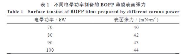 由表1可知,在70~100 kW范圍內(nèi),隨著電暈功率增大,BOPP薄膜表面張力越大。這是因?yàn)殡姇灩β试龃?,BOPP薄膜表面越粗糙,極性官能團(tuán)越多。根據(jù)潤濕擴(kuò)散理論,粗糙表面可以增加接觸面積,有利于液體的潤濕;極性官能團(tuán)越多,表面極性越好,也能讓BOPP薄膜獲得更好的潤濕性。因此,在一定范圍內(nèi),BOPP薄膜表面張力隨著電暈功率增大而增大。