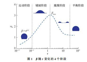 根據(jù)β隨τ變化情況,液滴碰撞分為運動、鋪展、弛豫和平衡4個階段,如圖1所示。在運動階段(τ<0.1),慣性力占主導地位,液滴上部仍保持球狀,下部鋪展成楔形邊緣,文指出該階段可忽略流體性質(zhì)影響,β隨τ呈指數(shù)上升,即β∝τb,其中指數(shù)b介于0.45到0.57之間,一般取b=0.5;在鋪展階段,受黏性力或毛細力的主導作用,β逐漸增至βmax,然后液滴開始回撤收縮,進入馳豫階段;在平衡階段,液滴可能穩(wěn)定鋪展,也可能發(fā)生反彈,或者碎裂飛濺。本文主要針對運動階段和鋪展階段進行研究。