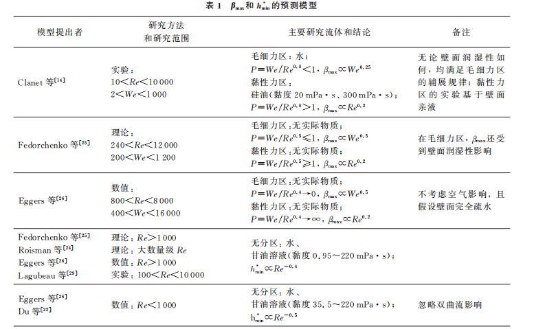 βmax和hmin*的多種預測模型如表1所示。從表1可以看出,在黏性力區(qū),已有的理論、實驗和模擬研究普遍認為βmax主要由Re控制,與Re0.2成正比,但目前實驗數(shù)據(jù)和模擬驗證均較少,已有實驗主要針對硅油、甘油溶液,黏度在300 mPa·s以內(nèi),缺乏對于更高黏度液體的研究;另外,Eggers等的模擬研究不針對真實流體,且忽略空氣影響和假設(shè)壁面完全疏水,與現(xiàn)實情況具有差異。在毛細力區(qū),盡管Eggers等的模擬結(jié)果與Fedorchenko等的理論相符合,都認為βmax∝We0.5,但Clanet等的實驗結(jié)果卻表明βmax∝We0.25,實驗所得We指數(shù)大小僅為理論的一半。因此,仍需對βmax進行更多的實驗、模擬研究。