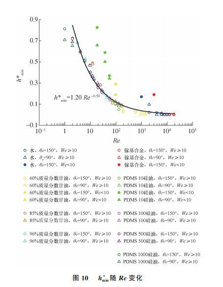 如表1所示,文認(rèn)為hmin僅與Re相關(guān)。從圖9中甘油溶液和PDMS硅油的曲線可以看出,二者Re相近,hmin幾乎相同,與已有結(jié)論一致;但對(duì)于We相近、Re相差較大的水和鎵基合金,二者也有相似的hmin.因此,hmin是否僅與Re相關(guān),需要進(jìn)一步探討。