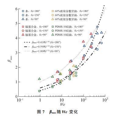 本文在毛細(xì)力區(qū)研究的流體包括水、60%質(zhì)量分?jǐn)?shù)甘油溶液、PDMS10硅油和鎵基合金,βmax隨We變化的情況如圖7所示。對(duì)不同潤濕性壁面的模擬結(jié)果進(jìn)行擬合,如圖7中虛線所示:當(dāng)θe=90°時(shí),βmax∝We0.26(R2=0.921);當(dāng)θe=180°時(shí),βmax∝We0.40(R2=0.990);當(dāng)θe=150°時(shí),βmax∝We0.29(R2=0.918),介于前兩者之間。因?yàn)檎鎸?shí)表面無法絕對(duì)疏水,所以Clanet等實(shí)驗(yàn)研究結(jié)果βmax∝We0.25更接近本文θe=90°的模擬結(jié)果,而Eggers等針對(duì)完全疏水表面提出的βmax∝We0.5更適用于θe=180°的情況。