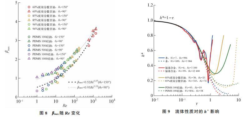 4)對(duì)于以往鮮有研究的高黏度PDMS1000硅油和超高表面張力的鎵基合金,盡管這2種流體物性較為特殊,但其碰撞過程仍主要受Re和We影響。但當(dāng)PDMS1000硅油以低速碰撞壁面時(shí),Re接近于1,此時(shí)液滴的入射動(dòng)能很快通過黏性力耗散殆盡,慣性力作用可忽略不計(jì),液滴在壁面上近似于自發(fā)鋪展,導(dǎo)致βmax和hmin*主要由液滴初始動(dòng)能和壁面潤濕性決定,偏離結(jié)論2和3中與We、Re之間的冪函數(shù)關(guān)系。