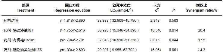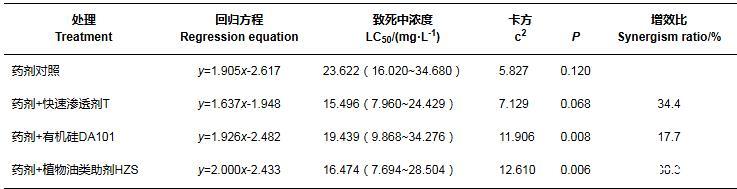 2.3噴霧助劑對2種藥劑防治石斛菲盾蚧室內(nèi)毒力的增效作用