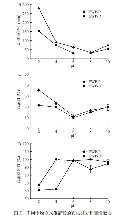 泡沫的形成依賴于由蛋白質(zhì)形成的界面膜及其在懸浮液中保持氣泡和減緩聚結(jié)速率的能力,其中蛋白質(zhì)的發(fā)泡能力和穩(wěn)定性與蛋白與水相在界面上的相互作用有關(guān),受蛋白分子柔性、凈電荷、構(gòu)象和疏水性的影響。蛋清蛋白在pH2.0~10.0條件下的起泡性如圖7C所示,EWP-D的起泡性優(yōu)于EWP-P,這可能是由于EWP-D的溶解度較高,在起泡過(guò)程中蛋白能迅速展開(kāi),形成能同時(shí)連接水相溶劑與空氣界面的兩性介質(zhì),而自身的帶電性又可產(chǎn)生一定的靜電排斥,使蛋白分子在空氣-水界面上呈現(xiàn)規(guī)律性排列,而不會(huì)發(fā)生聚集。相比之下,EWP-P在高溫發(fā)生的美拉德反應(yīng)會(huì)使蛋白形成更大的空間位阻,進(jìn)而延緩了蛋白質(zhì)在空氣/液體界面的吸附。pH為6.0時(shí),EWP-P和EWP-D的起泡性較低,分別是10.19%±1.01%和11.7%±0.66%,這是由于該pH下蛋白的溶解度和表面張力較低,蛋白易發(fā)生聚集,故不易形成泡沫。