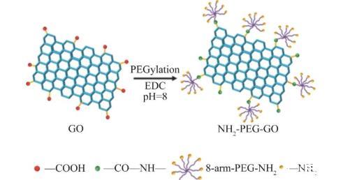 NH2-PEG-GO的制備方法:使用8-arm-PEG-NH2對GO表面進行修飾(圖1)。取80 mL上述細胞破碎機處理后的GO溶液,加入16 mL質(zhì)量濃度為2 mg/mL EDC來活化GO表面羧基,然后將混合溶液在功率為570 W條件下超聲30 min(開1.5 s,關1 s),待分散均勻后,再用5%NaOH溶液來調(diào)節(jié)溶液酸堿性(pH=8),隨后將240 mg 8-arm-PEG-NH2加入,超聲反應30 min后,再常溫攪拌反應12 h,離心水洗后得到氨基修飾的GO,于室溫真空冷凍干燥2 d后,得到最終產(chǎn)物,將產(chǎn)物研磨備用。