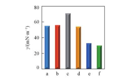 圖4對比了DA-GQD與文獻(xiàn)中常用于穩(wěn)定Pickering乳液的固體顆粒表面活性劑氧化石墨烯(GO)、石墨烯(G)、GQD和氧化亞銅(Cu2O)納米顆粒,以及典型陰離子表面活性劑SDBS的最低表面張力。結(jié)果顯示,GO,G和Cu2O納米顆粒具有較低的水溶性,可以將水的表面張力降低到50~60 mN/m之間,這主要?dú)w因于它們的強(qiáng)疏水性和弱親水性;而且GO和G中的大尺寸石墨烯二維片層容易聚集在流體界面上,增加了界面層的剛性,從而導(dǎo)致其表面活性的進(jìn)一步降低。而只以檸檬酸作為碳源,通過熱裂解法制備的GQD的表面張力約為71.8 mN/m,接近純水的表面張力。這是因?yàn)镚QD具有極強(qiáng)的親水性和極弱的疏水性,不合適的兩親結(jié)構(gòu)賦予其低的表面活性。此外,SDBS的表面張力為32.4 mN/m,比DA-GQD水溶液略高一些,證實(shí)了DA-GQD的表面活性與SDBS相當(dāng)。