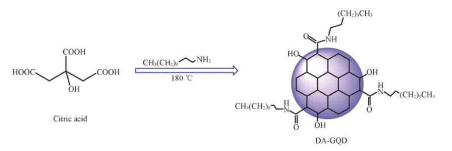 首先采用“自上而下”法,由CX-72炭黑在濃硝酸中回流24 h制備GQD。雖然能夠?qū)崿F(xiàn)一步同時(shí)制備單層和多層GQD,但是存在反應(yīng)時(shí)間長、強(qiáng)酸會對環(huán)境造成一定污染等弊端。本實(shí)驗(yàn)設(shè)計(jì)通過“自下而上”法,以檸檬酸為前驅(qū)體、直鏈烷基胺為功能化試劑,通過一步熱裂解制備雙親性DA-GQD(見圖1)。檸檬酸分子之間脫水縮合形成六邊形sp2碳原子鍵合的石墨烯片,十二胺通過氨基與檸檬酸上的羧基縮合,將烷基鏈引入石墨烯片的邊緣以提高疏水性。