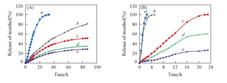 白家峰等采用聚多巴胺(PDA)修飾的介孔二氧化硅微球負(fù)載L-薄荷醇,發(fā)現(xiàn)PDA涂層有利于薄荷醇的可控緩慢釋放,在30℃空氣吹掃作用下,負(fù)載樣品中的薄荷醇在25 h后幾乎釋放完全;而在80℃空氣吹掃作用下,負(fù)載樣品中的薄荷醇在100 min后接近完全釋放??梢?,本研究制得的負(fù)載體系具有較優(yōu)的長效緩釋性能。