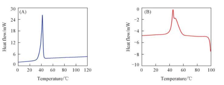 圖6(A)和(B)分別為空白樣品與負(fù)載型樣品的示差掃描量熱(DSC)曲線。從圖6(A)可以看出,L-薄荷醇樣品在大約42℃左右出現(xiàn)一個(gè)尖銳的吸熱峰,對(duì)應(yīng)于L-薄荷醇的熔點(diǎn)。而負(fù)載型樣品則出現(xiàn)了兩個(gè)吸熱峰[圖6(B)],其中第一個(gè)峰主要是由生長在DA-GQD外表面的薄荷醇小晶體融化引起的,而第二個(gè)峰主要是由DA-GQD包覆的薄荷醇小晶體融化引起的。這與劉紹華等的研究結(jié)果相類似。