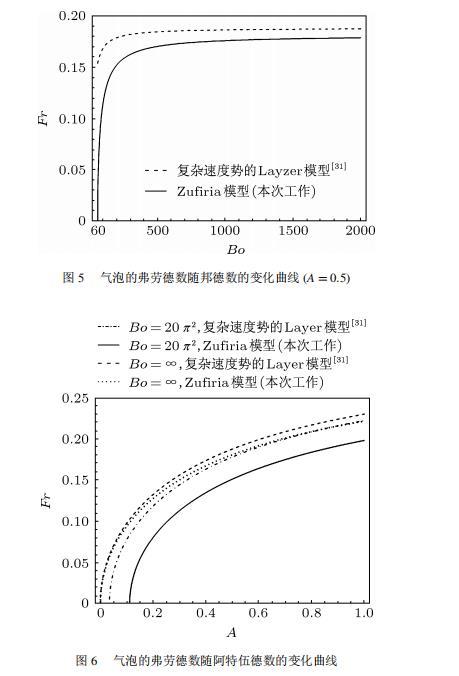 當取邦德數(shù)一定時,氣泡的弗勞德數(shù)隨阿特伍德數(shù)的變化如圖3所示。在圖3中Bo=20pi^2。從圖中可以發(fā)現(xiàn),利用Goncharov所提出的復(fù)雜速度勢運算的結(jié)果比本次工作稍微大一些。在阿特伍德數(shù)等于1時,兩種理論結(jié)果完全一致。當阿特伍德數(shù)較小時,兩種理論結(jié)果也基本一致。