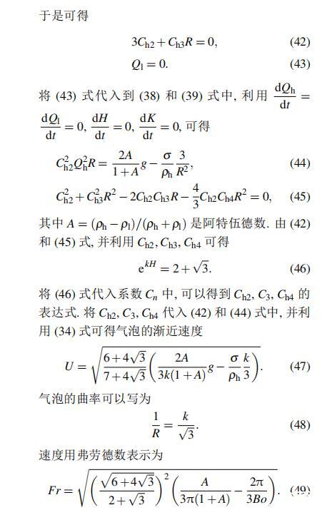將具有簡單速度勢的Layzer模型和Zufiria模型推廣至非理想流體情況,并分別利用這兩種模型研究了界面張力對Rayleigh-Taylor不穩(wěn)定性的影響。首先得到了兩種模型下氣泡的漸近速度和漸近曲率的解析表達式;其次系統(tǒng)研究了界面張力對氣泡的漸近速度和漸近曲率的影響;最后將兩種模型進行了比較,并將氣泡的漸近速度和數(shù)值模擬進行了比較。研究表明:界面張力壓低了氣泡的速度,但對曲率沒有影響;利用簡單速度勢的Layzer模型所得的氣泡的漸近速度比復(fù)雜速度勢的Layzer模型的值小,但是比Zufiria模型的值大;當阿特伍德數(shù)等于1時,簡單速度勢的Layzer模型和復(fù)雜速度勢的Layzer模型給出的結(jié)果一致。
