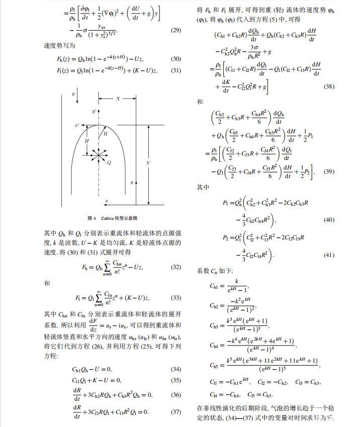 RT不穩(wěn)定性大致可以分為三個階段:早期線性增長階段、非線性增長階段和湍流混合階段。在早期階段,微擾振幅增長率呈指數(shù)增長,這一點人們已經(jīng)達成共識。當微擾振幅和波長可以比擬時,非線性發(fā)生,此時重流體以尖釘?shù)男问皆谳p流體中演化,而輕流體則以氣泡的形式在重流體中上升。在非線性增長的后期,氣泡和尖釘則是以恒定的速度增長。為了描述這一階段的演化,歷史上曾出現(xiàn)兩種主要的理論模型,一種是Layzer模型,另一種是Zufiria模型。1955年Layzer建立了適用于氣泡頂端附近的勢流模型,被稱之為Layzer模型。Zhang后來對該模型的速度勢進行了修改。Goncharov、Sohn等人分別提出了新的速度勢,將Layzer模型推廣并應(yīng)用于任意密度比情形。1988年Zufiria提出了另一種理論模型,該模型假想在氣泡的下面存在一個點源,又稱點源模型。Zufiria模型的速度勢是復(fù)數(shù),而Layzer模型的速度勢是實數(shù)。Zufiria模型的運算過程比Layzer模型復(fù)雜。早期Zufiria模型也只適用于無限密度比情形。后來Sohn將其推廣并應(yīng)用于任意密度比情形。