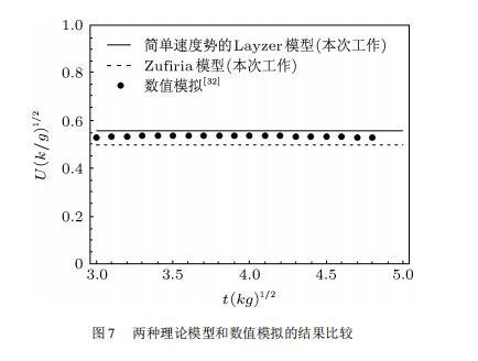 最后,我們將兩種理論模型的結(jié)果與數(shù)值模擬進行了比較,如圖7所示。在誤差允許的范圍內(nèi),Zufiria模型和Layzer模型與數(shù)值模擬符合的都很好。由簡單速度勢的Layzer模型得出的結(jié)果更接近于數(shù)值模擬。另外,從圖7中還可以看出,簡單速度勢的Layzer模型計算值比數(shù)值模擬結(jié)果高,而Zufiria模型比數(shù)值模擬低。這可能由于Zufiria模型假設(shè)速度勢是復(fù)數(shù)勢,會人為引進速度的耗散,導致結(jié)果比數(shù)值模擬低,而Layzer模型的計算值略高于數(shù)值模擬的原因可能由于數(shù)值模擬沒有達到漸近速度。