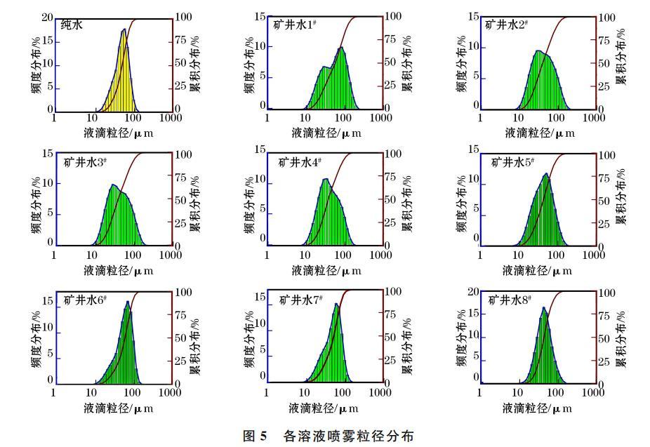 噴霧降塵效果與霧化特性參數(shù)密切相關(guān),其中霧滴粒徑是影響霧化特性的關(guān)鍵因素。9組溶液在15cm測點處的粒徑分布如圖5所示。由圖5可知,各溶液霧滴粒徑主要分布為25~75μm,純水、礦井水1#至4#和礦井水5#至8#噴霧粒徑位于該區(qū)間的平均比例分別為80.10%、55.87%、69.73%,礦井水1至8#的粒徑累積分布曲線斜率逐漸增加,這說明礦井水霧化效果不斷提升。由此可知,礦井水中Na+、K+離子濃度越低,霧滴粒徑分布越集中,其霧場更有利于呼吸性粉塵捕集。這是由于礦井水表面張力減小,霧滴破碎程度逐漸提高,致使霧滴細(xì)化且粒徑集中分布于25~75μm區(qū)間,這說明噴霧霧化特性隨表面張力減小不斷優(yōu)化,霧滴粒徑趨向均勻分布。綜上,礦井水中Na+、K+離子濃度差異改變其表面張力,從而影響噴霧粒徑分布、霧化百分比等特性。