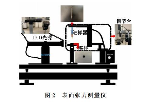 液體從噴嘴噴出初始階段,表面張力會對射流霧化產(chǎn)生阻礙作用,所以表面張力對噴霧場霧化性能有重要影響。測量表面張力時,調(diào)節(jié)樣品臺和光源在同一高度,在進樣器中裝入1mL待測礦井水后滴至測量臺,待測溶液與測量臺接觸瞬間,開始捕捉液滴形態(tài)。測量完畢后,利用數(shù)據(jù)處理系統(tǒng)處理試驗數(shù)據(jù)與圖像。