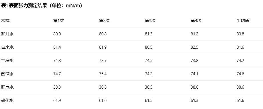 采用芬蘭Kibron公司生產(chǎn)的Delta-8全自動(dòng)高通量表面張力儀對(duì)不同種類的水在室溫下進(jìn)行測(cè)定,鉑金環(huán)浸入到水中一定的位置,隨著鉑金環(huán)與水之間的膜被拉長(zhǎng),使鉑金環(huán)受到一個(gè)向下的力,差動(dòng)變壓器的磁芯隨鉑金環(huán)的下降而上升,使差動(dòng)變壓器的線圈感應(yīng)出一定的電壓值,這樣將被拉伸的薄膜變形量轉(zhuǎn)化為電壓量,經(jīng)微機(jī)處理轉(zhuǎn)化為相應(yīng)的張力值,并自動(dòng)顯示出來。隨薄膜逐漸被拉長(zhǎng),張力值逐漸增大,直至薄膜破裂,記下的最大值即水的實(shí)時(shí)張力。