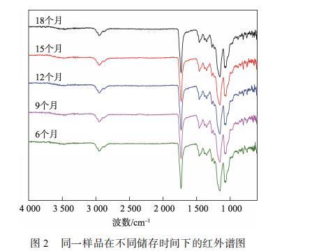 為了探究表面轉(zhuǎn)移涂層是否發(fā)生了結(jié)構(gòu)變化,對(duì)不同儲(chǔ)存時(shí)間下的樣品進(jìn)行紅外光譜測(cè)試分析,見(jiàn)圖2??梢钥闯觯瑑?chǔ)存時(shí)間為6—18個(gè)月的樣品的紅外譜圖并未發(fā)生明顯變化。譜圖的一致性證明了噴鋁紙表面轉(zhuǎn)移涂層的基本結(jié)構(gòu)并未隨著時(shí)間發(fā)生明顯變化,即掉墨現(xiàn)象的出現(xiàn)并非由于轉(zhuǎn)移涂層出現(xiàn)結(jié)構(gòu)變化導(dǎo)致。根據(jù)相關(guān)研究,噴鋁紙?jiān)趦?chǔ)存的時(shí)候,紙張及涂層中添加的助劑,環(huán)境介質(zhì)中的水分子、油污和空氣等小分子物質(zhì)會(huì)通過(guò)吸附、擴(kuò)散、遷移和凝集等作用,甚至鍵合等途徑,在轉(zhuǎn)移涂層表面形成低分子物質(zhì)的富集區(qū),即弱界面層,降低了轉(zhuǎn)移涂層的表面張力,并使其印刷適性變差。
