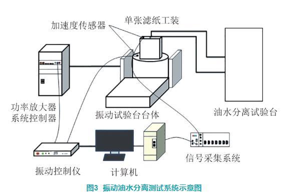 試驗的主要設(shè)備有電振動試驗臺、按照ISO 16332標準搭建的柴油–水分離試驗臺、加速度傳感器及信號采集系統(tǒng)、電子天平、庫倫法微量水測定儀、界面張力儀、黏度計等。