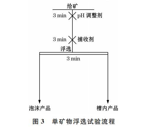 采用一次粗選的試驗(yàn)流程,探究十二胺(DDA)和YTDB在不同礦漿pH、不同捕收劑用量下,對(duì)石英以及赤鐵礦回收率的影響。單礦物浮選試驗(yàn)在XFD-Ⅲ浮選機(jī)進(jìn)行,在室溫條件下配制礦漿,稱取2.00 g的單礦物放入浮選槽中,再加入20 g去離子水,控制浮選機(jī)的攪拌速度為1900 r/min,攪拌2 min以充分?jǐn)噭虻V漿。加入事先準(zhǔn)備好的pH調(diào)整劑調(diào)漿3 min,再加入捕收劑調(diào)漿3 min后,開(kāi)始刮泡,控制刮泡時(shí)間為3 min.浮選結(jié)束后,將精礦進(jìn)行過(guò)濾、烘干、稱重,隨后計(jì)算其回收率。單礦物浮選試驗(yàn)流程如圖3所示。