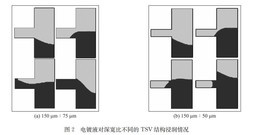 深寬比為150μm:75μm和150μm:50μm的TSV浸潤仿真結(jié)果分別如圖2的(a)(b)所示,前者可以完全浸潤,后者在TSV底部形成氣泡。模擬結(jié)果表明如果不進行充分潤濕,深寬比大于2:1的TSV就會因不能完整浸潤而在靠近TSV底部的位置形成部分表面緊貼TSV側(cè)壁的大氣泡,且該氣泡在之后的電鍍過程中難以排出,導致電鍍液無法接觸到TSV底部附近的位置,進而形成較大空洞。