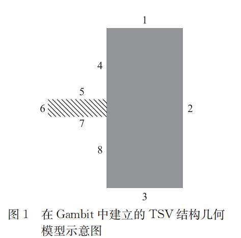 按照實際電鍍液及樣片的情況,在流體仿真軟件中進行建模。主要分為2個部分:前處理軟件Gambit中對平面模型的建立,F(xiàn)luent中對流場進行具體解算。本文截取TSV軸對稱結(jié)構(gòu)的中心軸截面,建立二維分析模型,直接反應實際TSV的浸潤過程。同時,基于對比實驗考慮,忽略電鍍液組分與被浸潤表面化學反應造成的界面影響,并直接采用與電鍍液物理性質(zhì)基本相同的水作為液相組分。氣相組分中采用理想不可壓氣體假設模擬正常大氣壓下的操作環(huán)境。建立的Fluent分析模型如圖1所示。其中較小的矩形塊代表TSV,4~8代表被潤濕表面。初始情況下,所有被模擬區(qū)域為氣相區(qū)域,之后液相從邊界3以特定流速進入(除流速討論單元,其余均設置為0.05 m/s),逐步潤濕全部或局部表面,直至從邊界1流出。具體設置為邊界1為壓力出口,2為對稱邊界,3為速度人口,4、5、6、7、8均為壁面邊界條件。表面張力和接觸角均采用實際測量值0.06 N/m,64°;重力加速度為9.81 m/s2,方向為豎直向下。