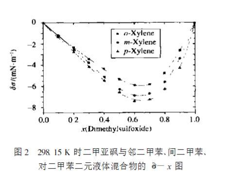 [圖2 298.15 K 時二甲亞砜與鄰二甲苯、間二甲苯、對二甲苯二元液體混合物的 δσ-x 圖]