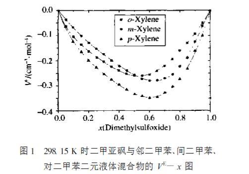 從圖1 可以看出,在298.15 K 時,二甲亞砜+鄰二甲苯、二甲亞砜+間二甲苯、二甲亞砜+對二甲苯共3 個二元混合物在全濃度范圍內(nèi)過量體積為負(fù)值,在最小值處大小順序為:鄰二甲苯>間二甲苯>對二甲苯。二甲亞砜是極性分子,存在 SO基團(tuán),是電子的受體;二甲苯分子中存在著大 π鍵,是電子授體,電子受體與電子授體之間形成 n -π配鍵,屬于弱化學(xué)作用,從而使他們組成的混合物體積收縮,過量體積呈現(xiàn)負(fù)偏差。