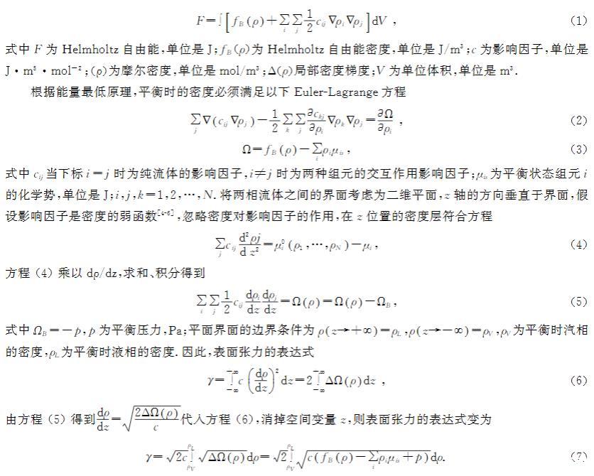 vanderWaals首先提出了密度梯度理論,并將該理論用于氣液界面,通過(guò)對(duì)氣液界面的研究得出結(jié)論,界面處的密度變化是連續(xù)的,后來(lái)該理論被Cahn和Hilliard完善。該理論中,界面的Helmholtz自由能密度為兩部分的加和:均相部分和非均相部分。Helmholtz自由能密度Taylor級(jí)數(shù)的二階展開(kāi)式為
