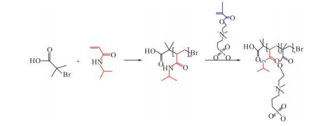 首先將a-溴代異丁酸(0.0167g,相當于0.1mmol)、NIPAM單體和5mL去離子水加入至真空反應管I中。隨后,利用超聲處理直至所有固體組分完全溶解,充入氮氣作為保護氣持續(xù)10min。另外,在真空反應管II中添加CuBr(0.0036g,0.025mmol)和2mL去離子水,進一步加入Me。TREN配體(13.4μL,0.05 mmol)和PMDETA配體(8.9μL,0.05mmol),充入氮氣保護10min。在保持氮氣氛圍的條件下,使用真空注射器將真空反應管I中的內容物轉移到真空反應管II中并進行密封,反應30min。此外,在真空反應管III中將甜菜堿單體和5mL去離子水混合,經過超聲處理直到完全溶解,充入氮氣保護10min。NIPAM聚合反應啟動1h后,再將真空反應管III中的物質通過真空注射器,在氮氣保護下加入到反應管II中,繼續(xù)反應2h以確保反應徹底完成。反應完成后,將反應液置入截留分子量為3500的透析袋中,用去離子水透析48h,每8h更換一次水。最終,將透析后的溶液進行冷凍干燥處理,去除所有水分,從而得到最終產物。在整個合成過程中,控制加入的單體總的物質的量為10mmol,根據NIPAM的加入比例(分別為100%,80%,50%,40%,20%和0%)合成了一系列P(NIPAM-b-DMMPPS)嵌段聚合物。這些聚合物根據其NIPAM的比例命名為PN_100,PN_80,PN_50,PN_40,PN_20和PN_0,以便于后續(xù)的實驗分析與研究。精確控制實驗條件和原料比例。聚合過程如Scheme1所示。