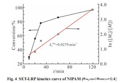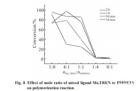 從Fig.4可以看出,當(dāng)混合配體n(Me6TREN):n(PMDETA)=4:1時(shí),轉(zhuǎn)化率隨反應(yīng)時(shí)間延長(zhǎng)而增大,反應(yīng)時(shí)間為2h時(shí),轉(zhuǎn)化率達(dá)到95%。