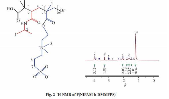 對(duì)P(NIPAM-b-DMMPPS)進(jìn)行核磁表征,結(jié)果如Fig.2所示。δ1.19處的1峰屬于CCH3;δ3.97處的2峰屬于一CH2一。同樣,P(NIPAM-b-DMMPPS)中譜圖中也有對(duì)應(yīng)于PDMMPPS的特征峰:δ3.60~3.67,δ3.11,δ2.17,δ2.95處的峰分別代表PDMMPPS中一N+一CH2一,一N+一(CH3)2,一CH2一和一CH2一SO3一上的氫質(zhì)子峰。核磁結(jié)果表明了嵌段聚合物P(NIPAM-b-DMMPPS)的成功合成。