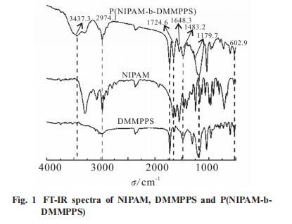 對(duì)單體NIPAM,DMMPPS及共聚物P(NIPAM-b-DMMPPS)進(jìn)行紅外表征,結(jié)果如Fig.1所示。通過(guò)對(duì)比分析可以看出,P(NIPAM-b-DMMPPS)紅外譜圖中,3437cm-1為PNIPAM鏈段酰胺基中仲胺N-H的伸縮振動(dòng)吸收峰,2974cm-1為飽和C-H伸縮振動(dòng)吸收峰,1724cm-是PNIPAM鏈段中羰羰基C=O的伸縮振動(dòng)吸收峰,1648cm-1的吸收峰為O-C=O的伸縮振動(dòng)峰,1483cm-1為飽和一CH2一的伸縮振動(dòng)峰,1179cm-1是PDMMPPS鏈段中S=O鍵的吸收峰,603 cm-1為C一Br的振動(dòng)峰。紅外光譜結(jié)果分析表明,此共聚物由單體NIPAM,DMMPPS合成為預(yù)期的目標(biāo)產(chǎn)物。