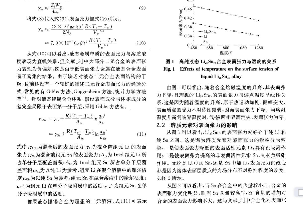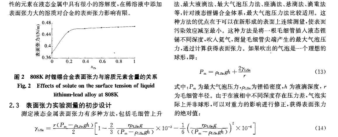 核能是公認(rèn)現(xiàn)實(shí)可行的、可大規(guī)模替代常規(guī)能源的清潔能源。聚變堆或聚變_裂變混合堆液態(tài)金屬包層因其固有特性和優(yōu)勢(shì),在國(guó)際上被普遍認(rèn)為是未來(lái)電站最具發(fā)展?jié)摿Φ陌鼘釉O(shè)計(jì)方案之一。作為包層氚增殖劑和冷卻劑的鋰錫合金與鋰鉛合金一樣,具有廣闊的發(fā)展前景,其制備、純化、質(zhì)量輸運(yùn)等工藝難題正逐步得到重視。液態(tài)金屬的表面張力不僅是認(rèn)識(shí)和理解冶煉過(guò)程最基本的物理量之一,而且是氣體吸收、氣泡形核、雜質(zhì)生長(zhǎng)等界面現(xiàn)象的控制因素。目前對(duì)液態(tài)金屬表面張力的研究多集中于金屬單質(zhì),合金的表面或界面行為在理論或?qū)嶒?yàn)上都相當(dāng)不足,主要是由于精確確定表面張力十分困難[2]。針對(duì)液態(tài)鋰錫合金這種新型的核材料,從基礎(chǔ)研究方面看,目前還沒(méi)有一種實(shí)驗(yàn)方法能確定液體界面的結(jié)構(gòu),即兩個(gè)相之間過(guò)渡區(qū)域的結(jié)構(gòu),因此需要有一些假設(shè)或模型來(lái)滿足表面張力理論的研究。