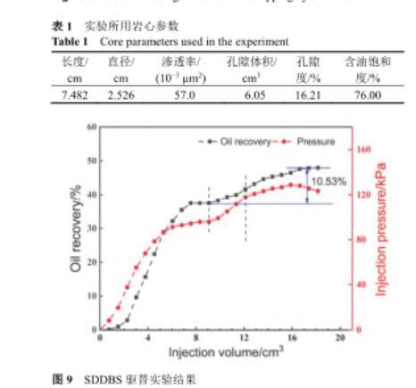 結(jié)合上述研究,選取0.02%(w)SDDBS溶液作為驅(qū)油劑進行巖心動態(tài)驅(qū)替實驗.本實驗使用的巖心參數(shù)如表1所示.驅(qū)替實驗共分為三個過程:模擬地層水驅(qū)、表面活性劑驅(qū)、后續(xù)模擬地層水驅(qū).驅(qū)替結(jié)果如圖9所示,初期地層水驅(qū),當(dāng)采出液含水率>98%時,計算采收率為37.36%.當(dāng)注入3.025 cm3 SDDBS溶液后采收率提高至41.67%,注入壓力升高.恒溫保持12 h后進行后續(xù)水驅(qū),注入壓力逐漸升高,且當(dāng)采出液含水率>98%時,計算采收率為47.89%.說明SDDBS溶液驅(qū)在水驅(qū)基礎(chǔ)上提高采收率10.53%,具有優(yōu)異的驅(qū)油效果.