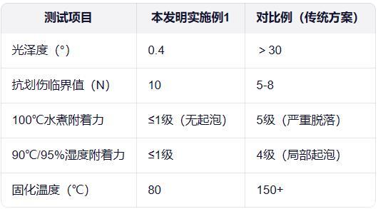 失效分析:對(duì)比例2(高羥樹脂<5份)因交聯(lián)密度不足,抗劃傷性能僅5N;對(duì)比例5(純高羥樹脂)因未反應(yīng)羥基殘留,水煮后附著力驟降。本發(fā)明通過(guò)樹脂配比精準(zhǔn)控制,兼顧啞光需求與力學(xué)性能。