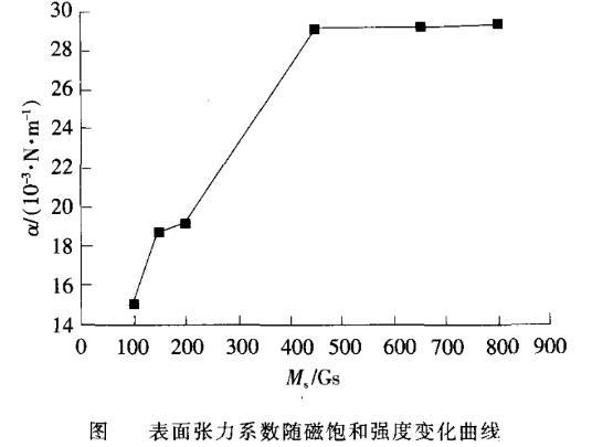 由圖7可知,α與Ms有關(guān)。Ms小于120Gs時(shí),α與Ms成正比;大于120Gs小于200Gs時(shí),α緩慢增加;大于200Gs小于440Gs時(shí),成線性增加;大于440Gs時(shí),基本恒定。這種變化規(guī)律主要是由于不同磁飽和強(qiáng)度的磁性液體所含磁性顆粒的數(shù)目不同所致。