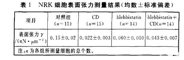實(shí)驗(yàn)中,分別單獨(dú)加入骨架蛋白抑制劑2μmol/L CD和30μmol/L blebbistatin,再同時(shí)加入2μmol/L CD和30μmol/L blebbistatin。各組細(xì)胞處理15~20 min后進(jìn)行細(xì)胞表面張力測(cè)量。利用公式(1)計(jì)算細(xì)胞表面張力,實(shí)驗(yàn)結(jié)果見表1。